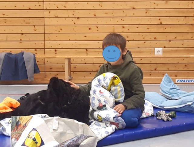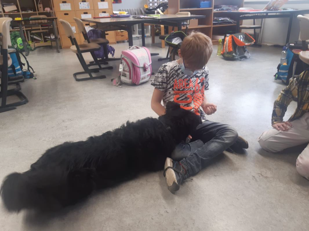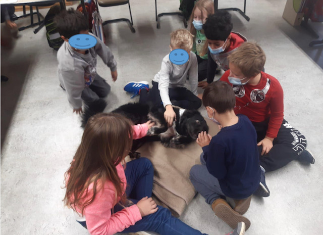 Abgesehen davon ist er einfach nur gerne im Unterricht dabei, legt sich zu einem Schüler unter den Tisch, wartet auf Streicheleinheiten, unterstützt durch seine Anwesenheit positiv bei Diskussionen im Klassenrat oder ist am Leseabend mit dabei.